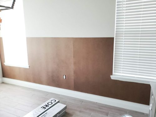 Tip: If you’re planning on painting the board and batten a different color than the baseboards, it’s easiest to go ahead and paint the cove molding now to match your baseboards. Fill the nail holes with caulk and then paint with the same paint as your baseboards, usually a semi-gloss white.